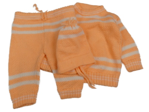 3set - Oranžovo-biely pruhovaný svetr + kalhoty + čapica