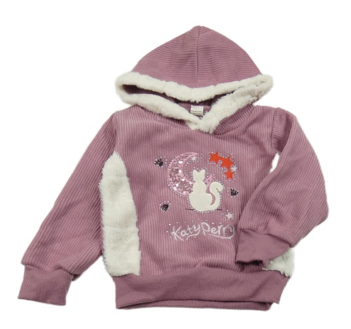 Staroružová rebrovaná mikina s bílým chlupatým lemem a mačkou a kapucňou