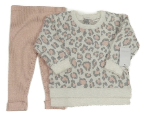 Nové - 2 set - svetloružové pletené rebrované legíny + bielo-sivý chlpatý leopardí sveter