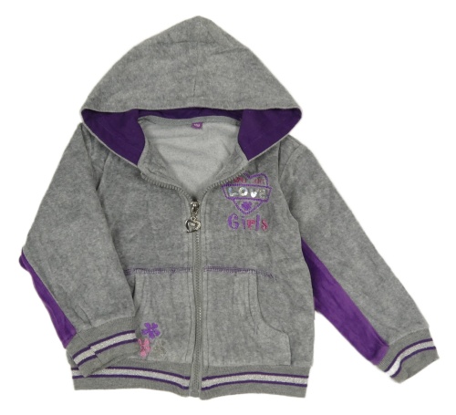 Sivo-purpurová zamatová prepínaci mikina s nápismi a srdiečkom a flitrami a kapucňou