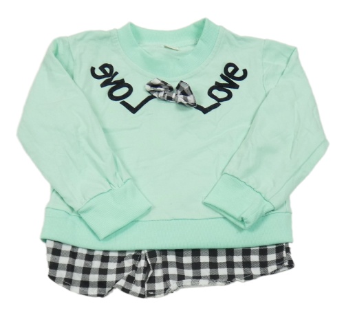 Mátová mikina s nápisom a mašlou a všitou černo/bílou kostkovanou halenkou
