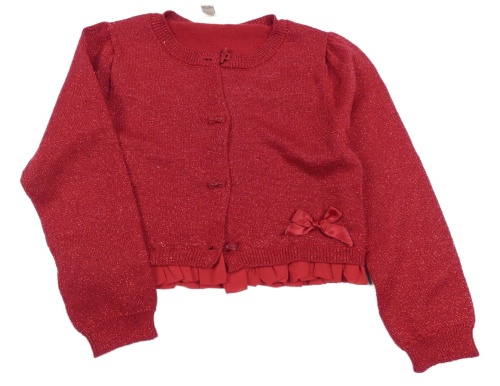 Červené melírované propínací svetrové bolérko s mašlou a trblietkami a volánikom Fagottino