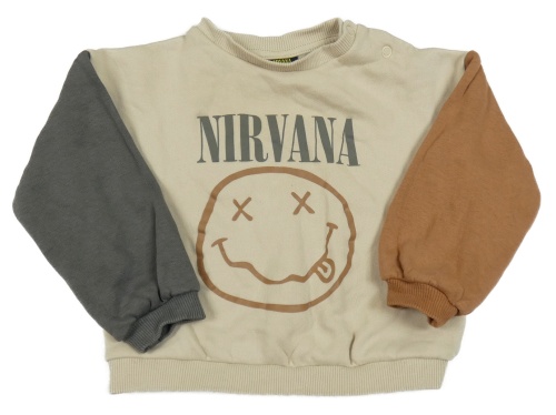 Smetanovo-hnedo-tmavosivá oversize mikina so smajlíkom a nápisem - NIRVANA