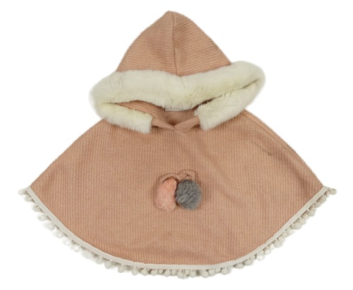 Ružové svetrové pončo s bambulemi a kapucňou s kožešinou a strapcemi