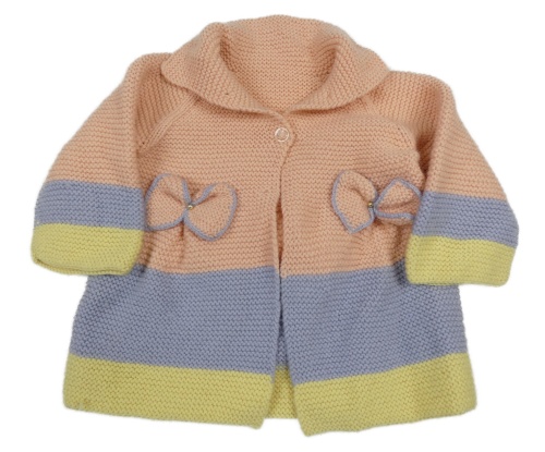 Ružovo-modro-žltý pruhovaný prepínaci sveter s mašľami