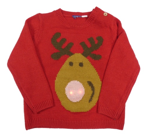 Červený pletený sveter so sobom a blikátkem a medodií lupilu