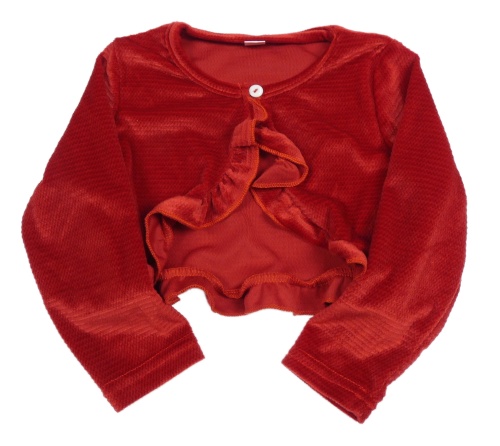 Červené vzorované sametové propínací bolérko s volánikmi
