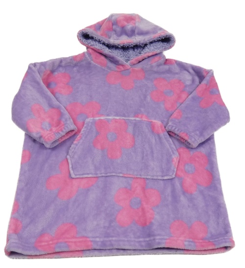 Lila chlpatá oversize mikina s kvetmi a kapucňou