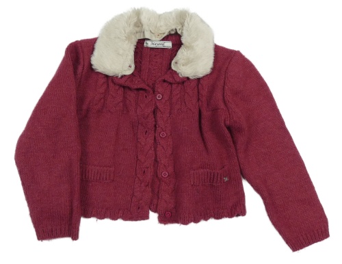 Vínový prepínaci crop sveter so vzorom a kožušinovým golierikom Mayoral