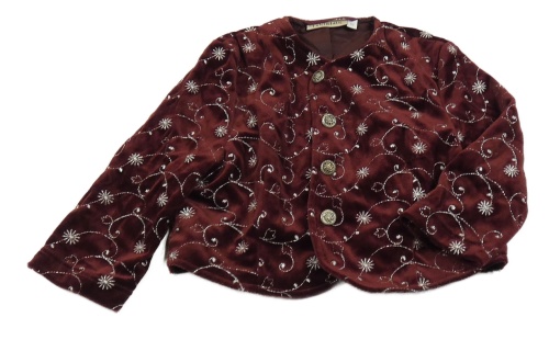Vínový sametový propínací kabátek so stříbrným vyšíváním C&A