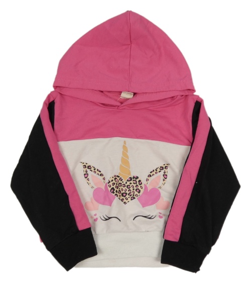 Tmavorůžovo-bielo-čierna mikina s jednorožcom a kapucňou