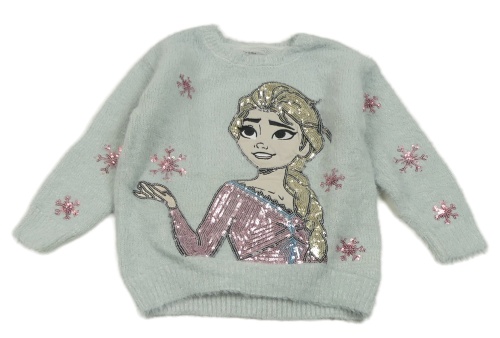 Svetlomodrý trblietavý chlpatý sveter s Elsou a vločkami z flitrů C&A