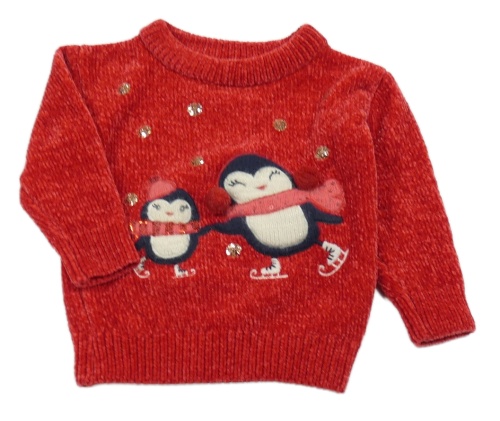 Červený melírovaný žinylkový sveter s tučňáčky a flitrami C&A