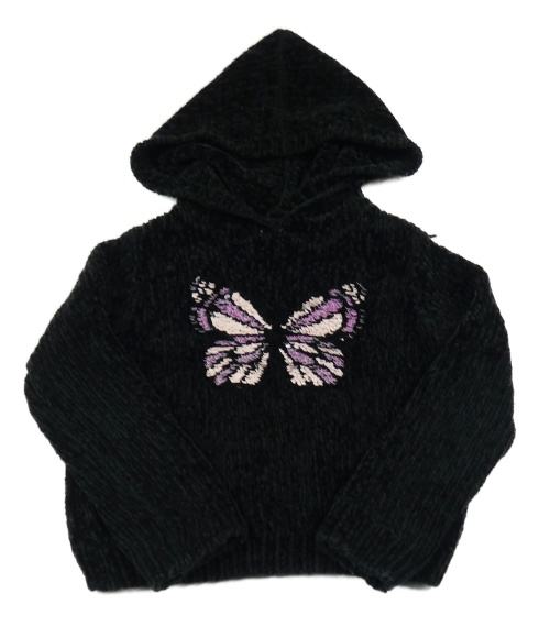 Čierny melírovaný žinylkový sveter s motýlkem z překlápěcích flitrů a kapucňou dopodopo