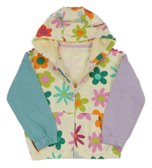 Smetanovo-lila-svetlomodrá prepínaci kvetovaná mikina s kapucňou