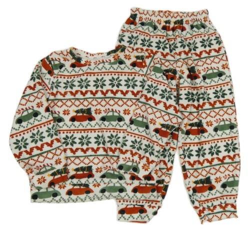 Bielo-rezavo-šalvějové vzorované plyšové pyžama s autami a vločkami Tu