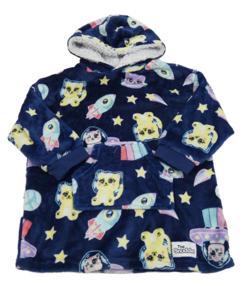 Tmavomodrá plyšová oversize dlhá mikina s raketami a kočičkami a vreckom a kapucňou PRIMARK