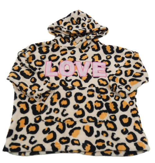 Pudrovo-čierno-oranžová vzorovaná plyšová oversize dlhá mikina s nápisom a vreckom a kapucňou MISO