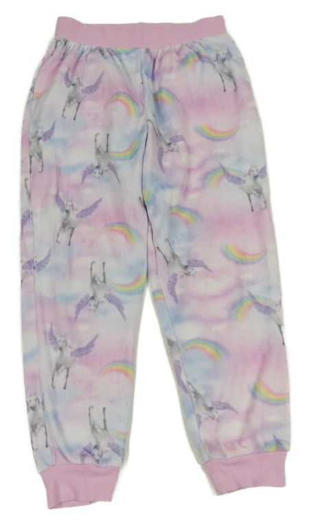 Růžovo-světlemodro-lila plyšové pyžamové nohavice s jednorožcami a duhami F&F