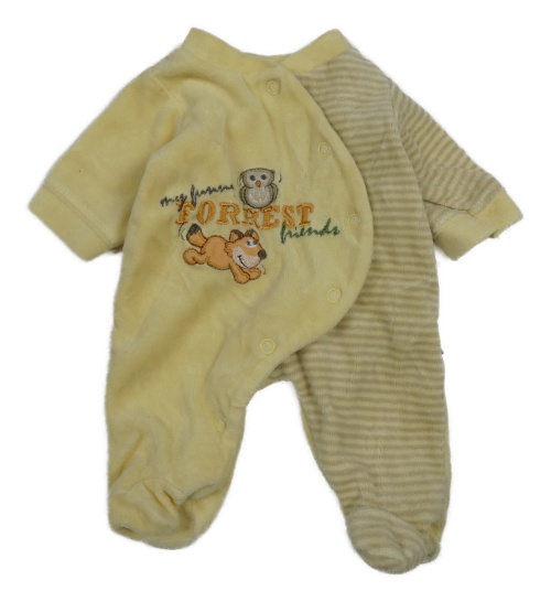 Světležluto/hnědý zamatový overal s líškou a sovičkou a nápismi a pruhmi