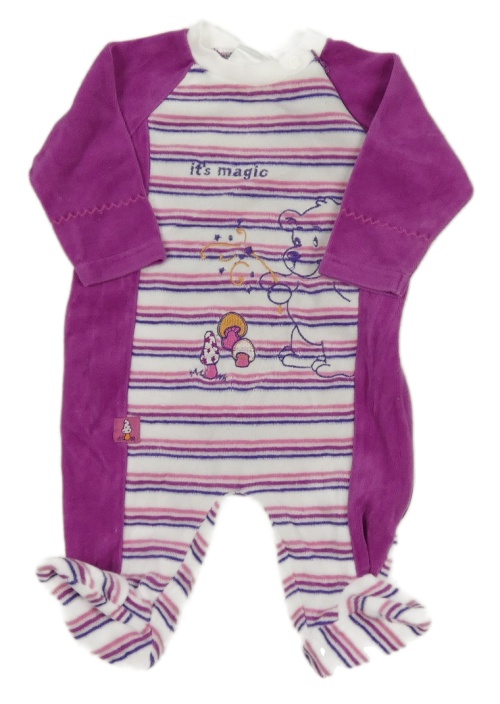 Purpurovo-bielo-pruhovaný zamatový overal s nápisom a medvěďom
