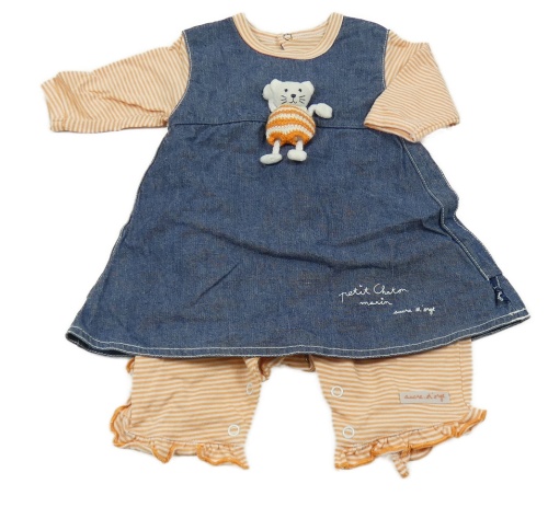 Oranžovo-biely pruhovaný overal s našitými rifľovými šaty s 3D mačičkou