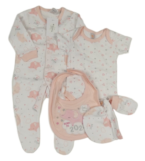 Nové - 5 set - bielo-ružový vzorovaný overal so slony + body + brnydák + čepice + rukavice