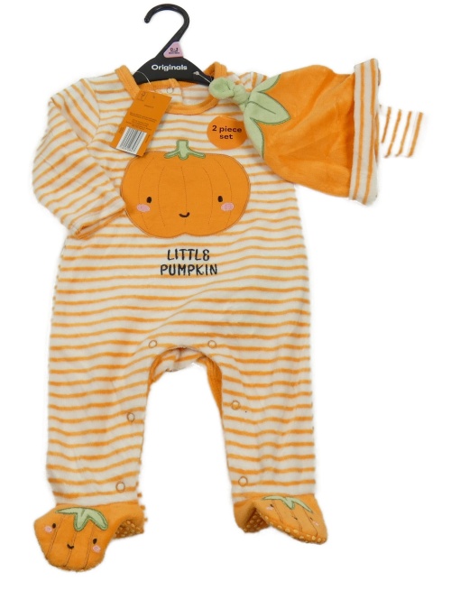 Nové - 2set - Oranžovo-biely pruhovaný zamatový overal s dýní + čapica