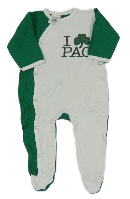 Bielo-tmavozelený overal s nápismi a trojlístkem
