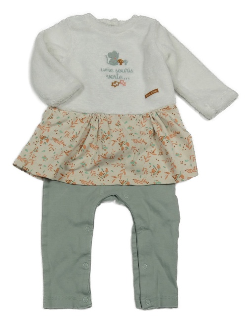 Bílo-béžovo-khaki chlupato/bavlněný overal s myškou a nápisom
