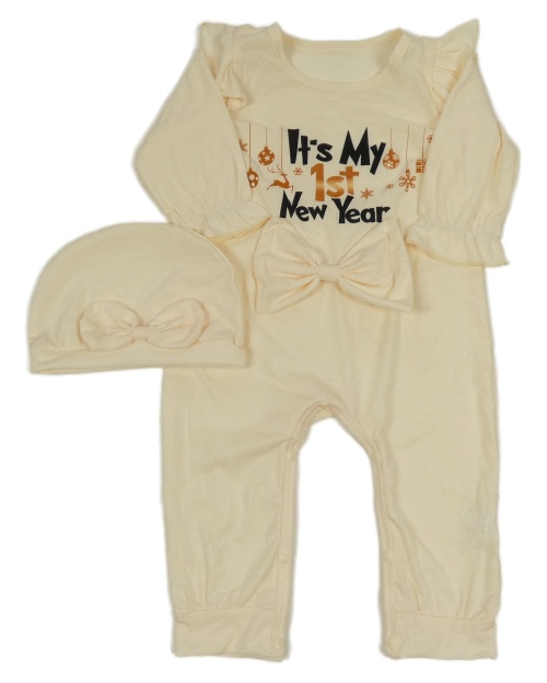 2 set - smotanový overal s nápisom a mašlí + ľahká čapica s mašlou