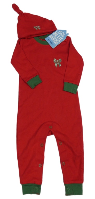 Nový - 2Set - Červeno-tmavozelený vianočný overal s mašlou a nápisy + čapica little BLUE HOUSE