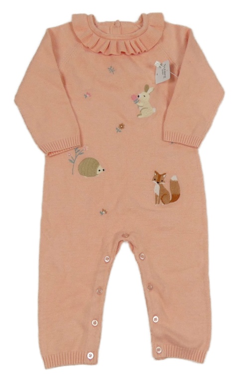 Nové - broskvový úpletový overal overal so zvieratkami a volánikom Nutmeg