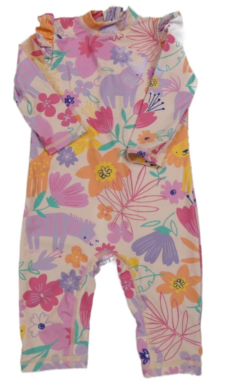 Světlepudrový UV overal s kvietkami a zvieratkami a volánikmi Nutmeg