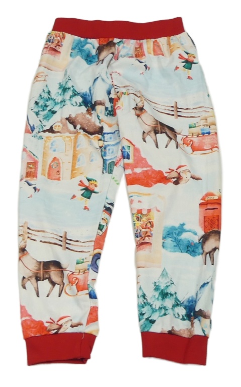 Bielo-barevno-červené rebrované pyžamové vianočné nohavice so sobmi a domečky