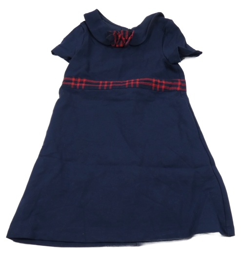 Tmavomodré šaty s kockovaným pruhom a mašlou a golierikom St. Bernard