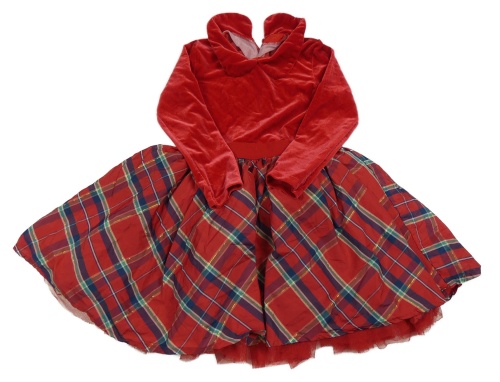 Červeno-tmavomodro-zelené zamatové šaty s kostkovanou sukní a golierikom Dunnes Stores