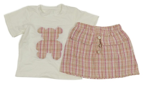 2 set - biele tričko s medvědem + ružová vzorovaná úpletová sukňa