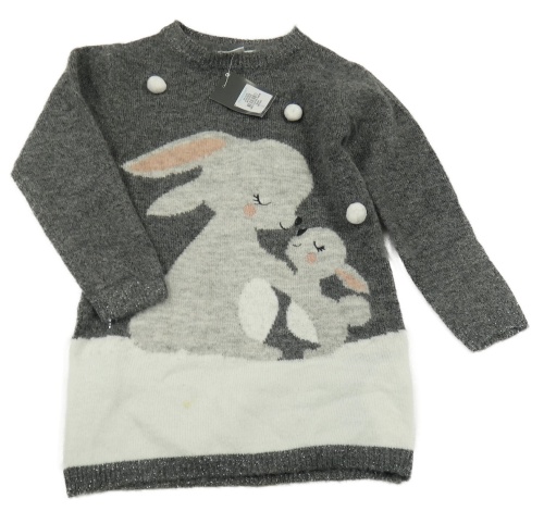 Nové - tmavošedo-biele melírované svetrové šaty s králíčky a bambulkami PRIMARK