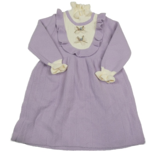 Světlefialovo-smotanové svetrové šaty s mašľami a volánikom a rolákom