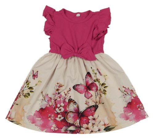 Světlepudrovo-tmavoružové šaty s motýlikmi a škvrnami a žebrováním a volánikmi