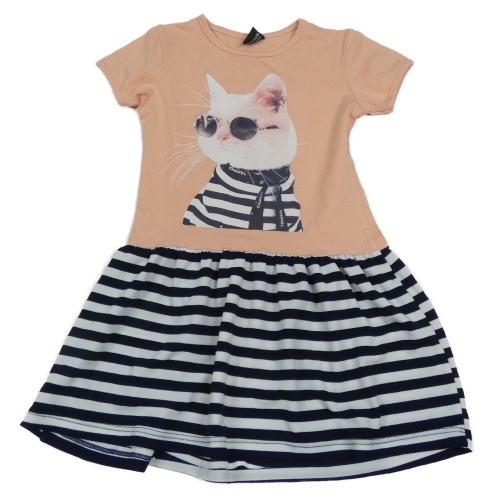 Ružovo-tmavomodro-biele šaty s mačičkou a pruhovanou sukní