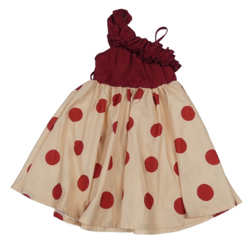 Vínovo-ružové asymetrické šaty s bodkami a volány