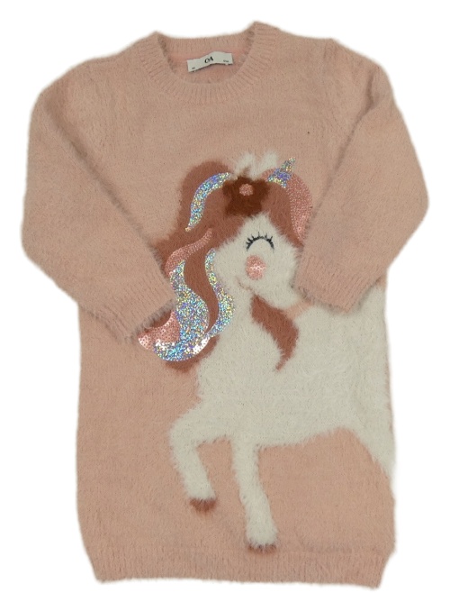 Svetloružové pletené chlpaté šaty s jednorožcom C&A