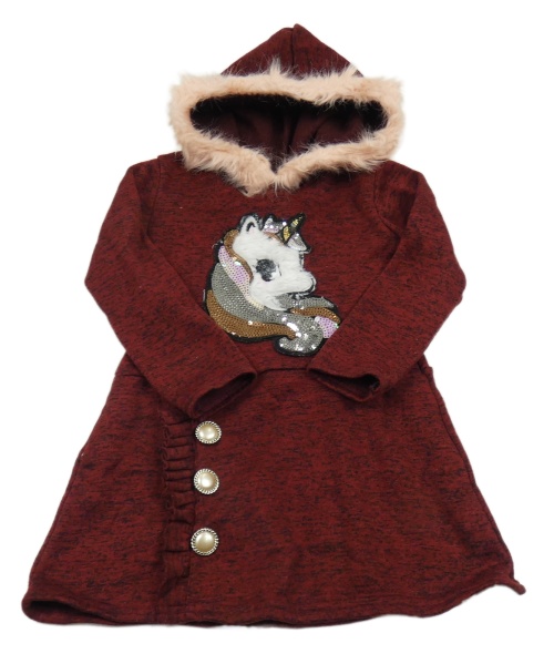 Bordó-čierne melírované pletené šaty s jednorožcom a kapucňou