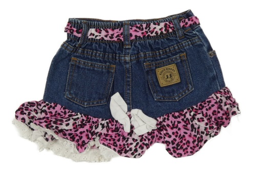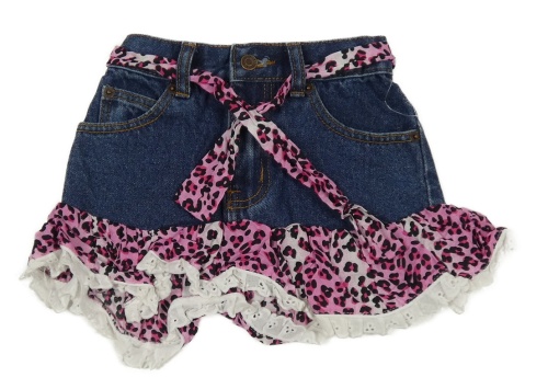 Nové - modrá rifľová sukňa s ružovymi volániky a opaskom