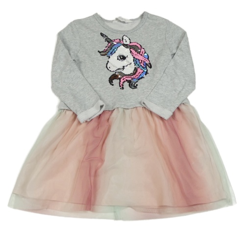 Sivo-ružovo-mátové melírované teplákovo/tylové šaty s jednorožcom s překlápěcími flitre H&M