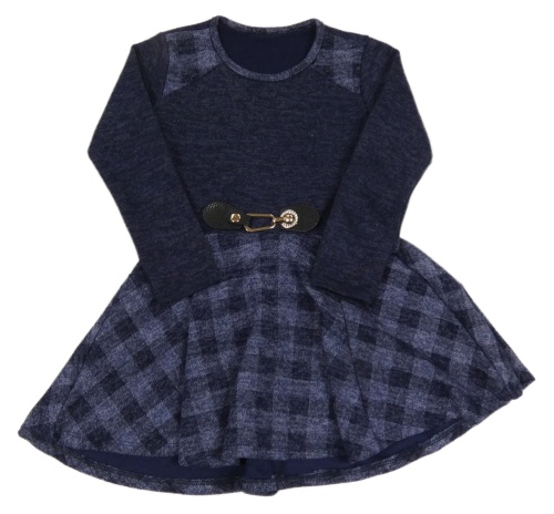 Tmnavomodré úpletové šaty s kostkovanou sukní a přezkou