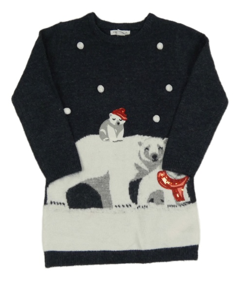 Tmavomodro-biele melírované svetrové šaty s ledními medvedíkmi s flitrami a bambulkami PRIMARK