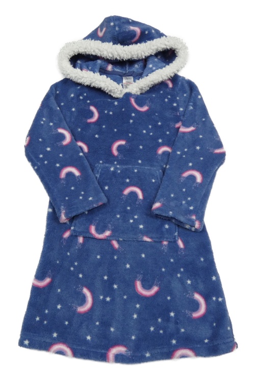 Tmavomodré chlpaté šaty s duhami a kapucňou